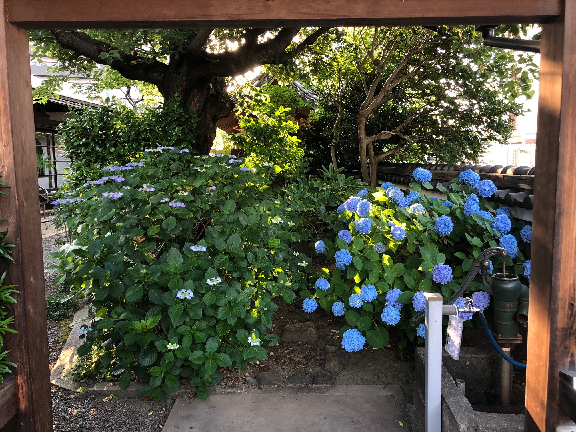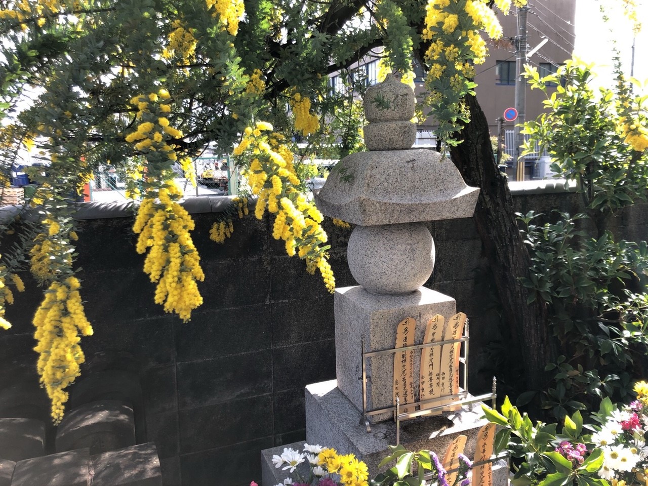 当寺墓地の奥、万霊塔(永代供養塔)の横にあります。満開になると、お墓も明るく華やかになります。