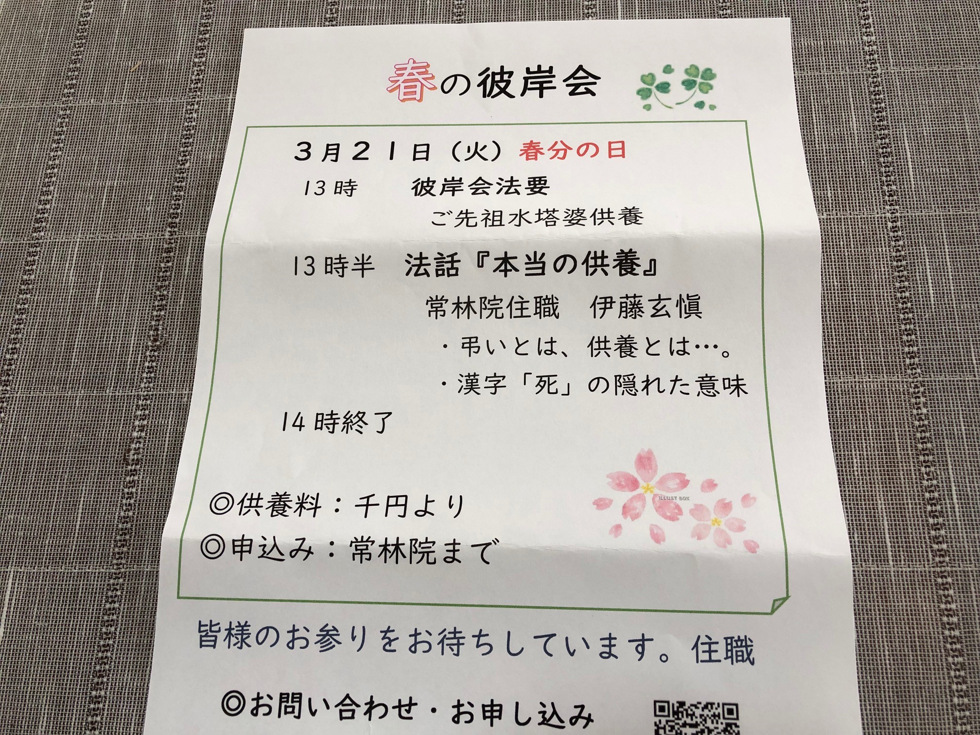 春の彼岸会の季節となりました。当寺の法要は3月21日の春分の日に勤めます。法要30分、法話30分の短い時間ですが、皆様とともにお勤めしたいと思います。よろしくお願いいたします。