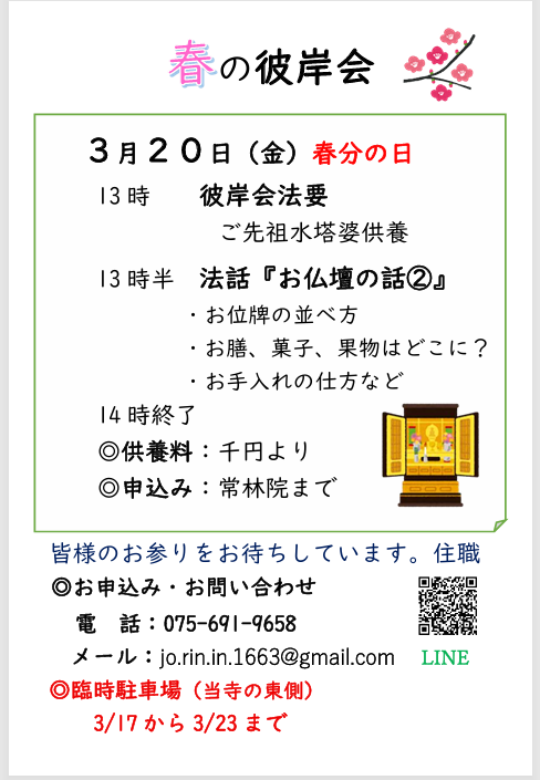 3月20日春分の日。当寺の春の彼岸会を厳修いたします。皆さまのお参りをお待ちしています。