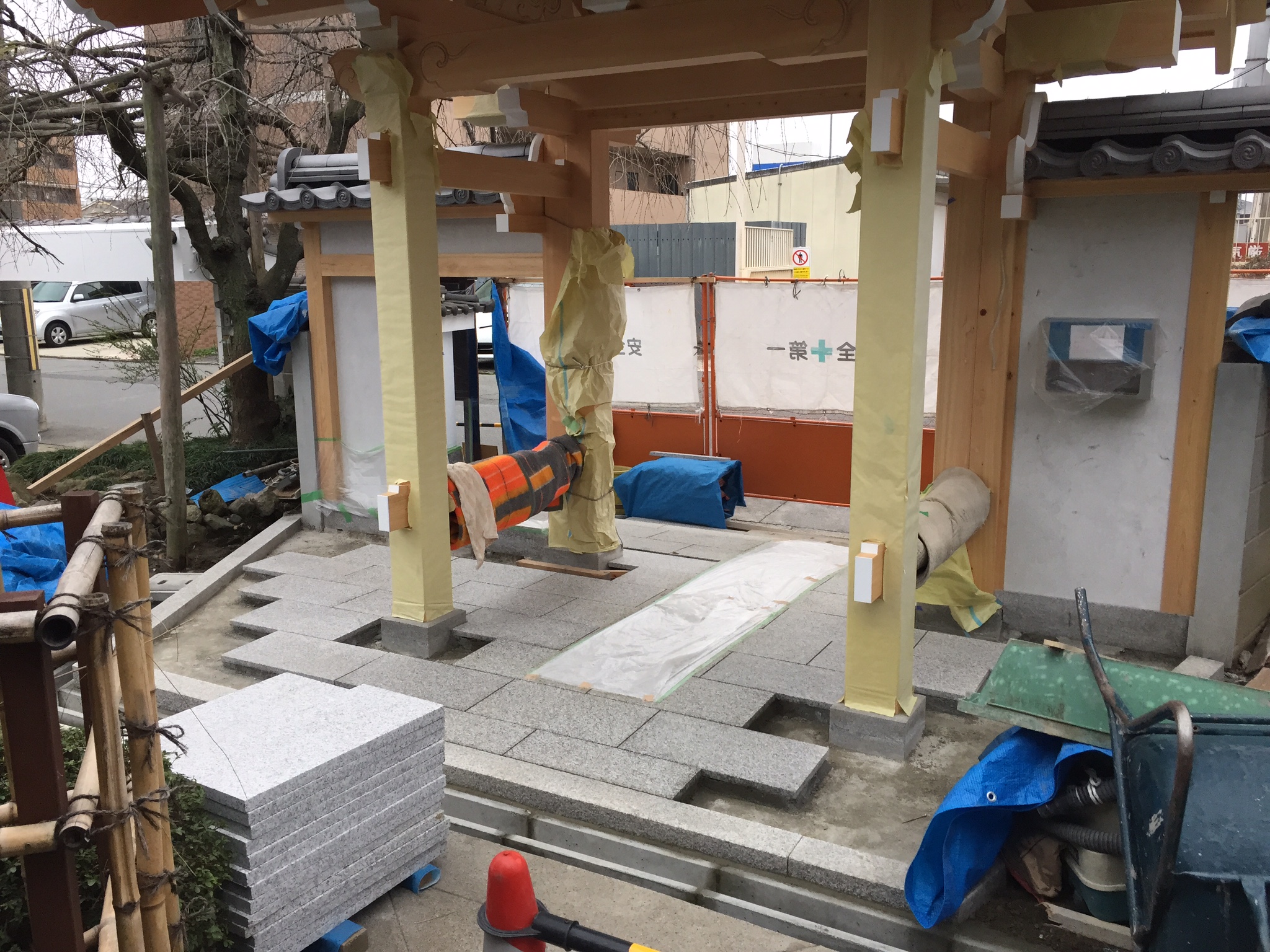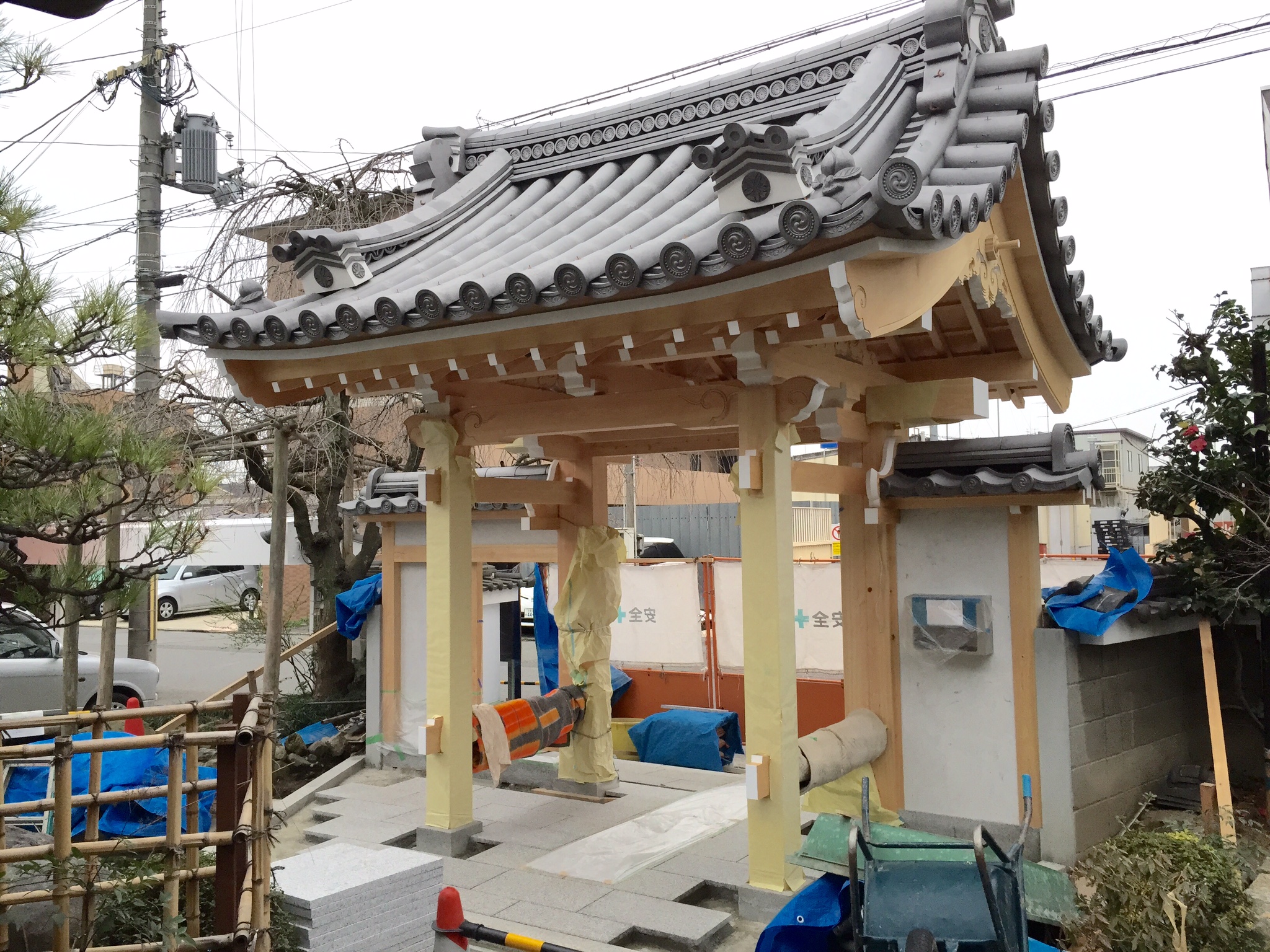 山門の瓦も葺かれ、現在は山門土間と外塀の壁の工事にとりかかっています。