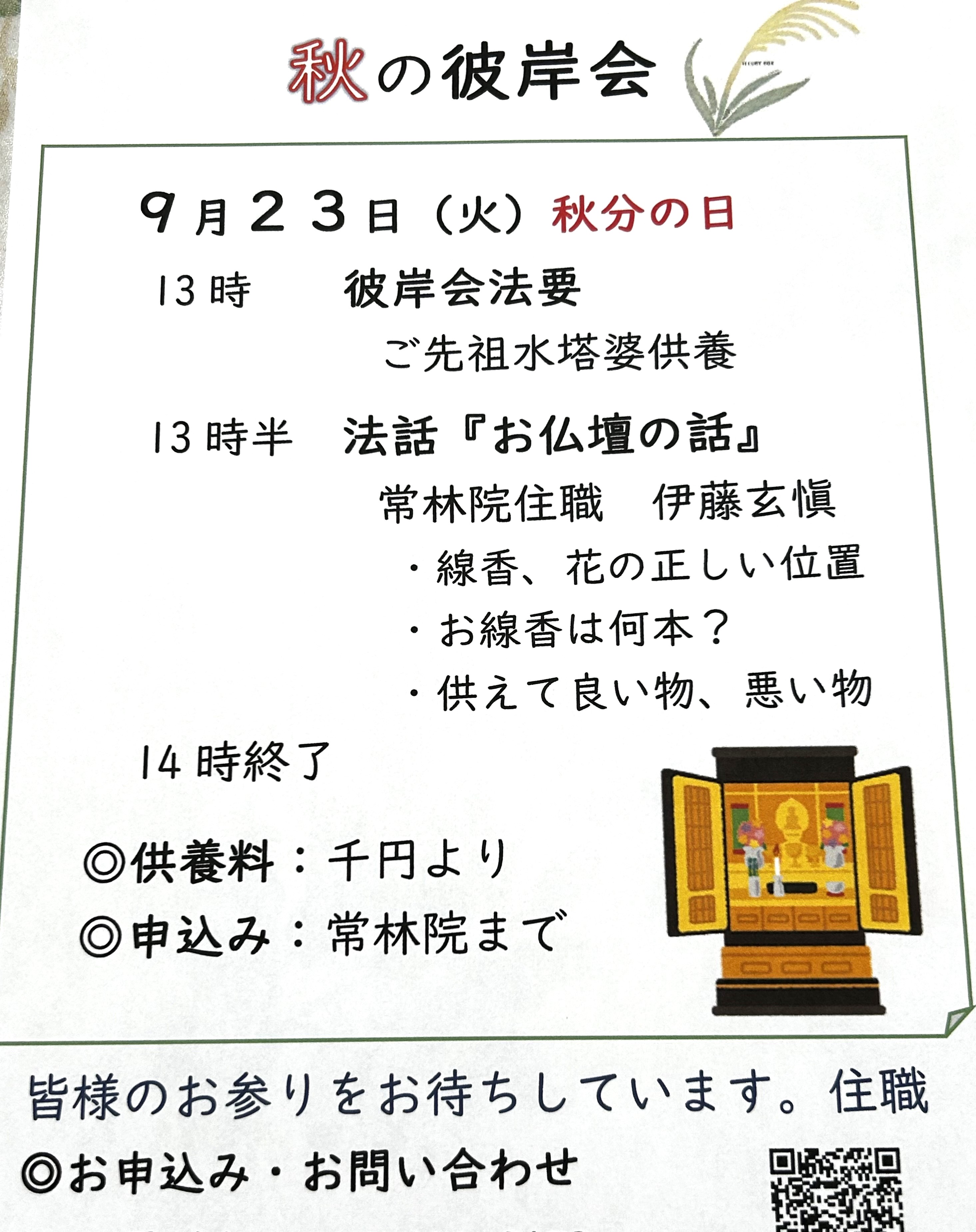 9月23日の彼岸の中日に、当寺の彼岸会を厳修いたします。今回は、法要の後、「お仏壇の話」をします。檀信徒の皆様、お誘いあわせの上どうぞお参りください。